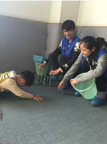 第一次到达儿童心理治疗室的我们,有点无措,在医生阿姨的帮助下我们渐渐融入了“小盆友”的世界,这里的”小盆友”多数是多动症(多动症主要表现在好动,注意力不集中),我们的工作主要是计数和辅助”小盆友”们完成有益于治疗的游戏。在陪”小盆友”愉快的玩耍时,我被他们每个人感动,其中最考验耐力的是滑板手滑35个来回,感觉我们这些成年人都完不成的事,”小盆友”们都很棒的完成了。