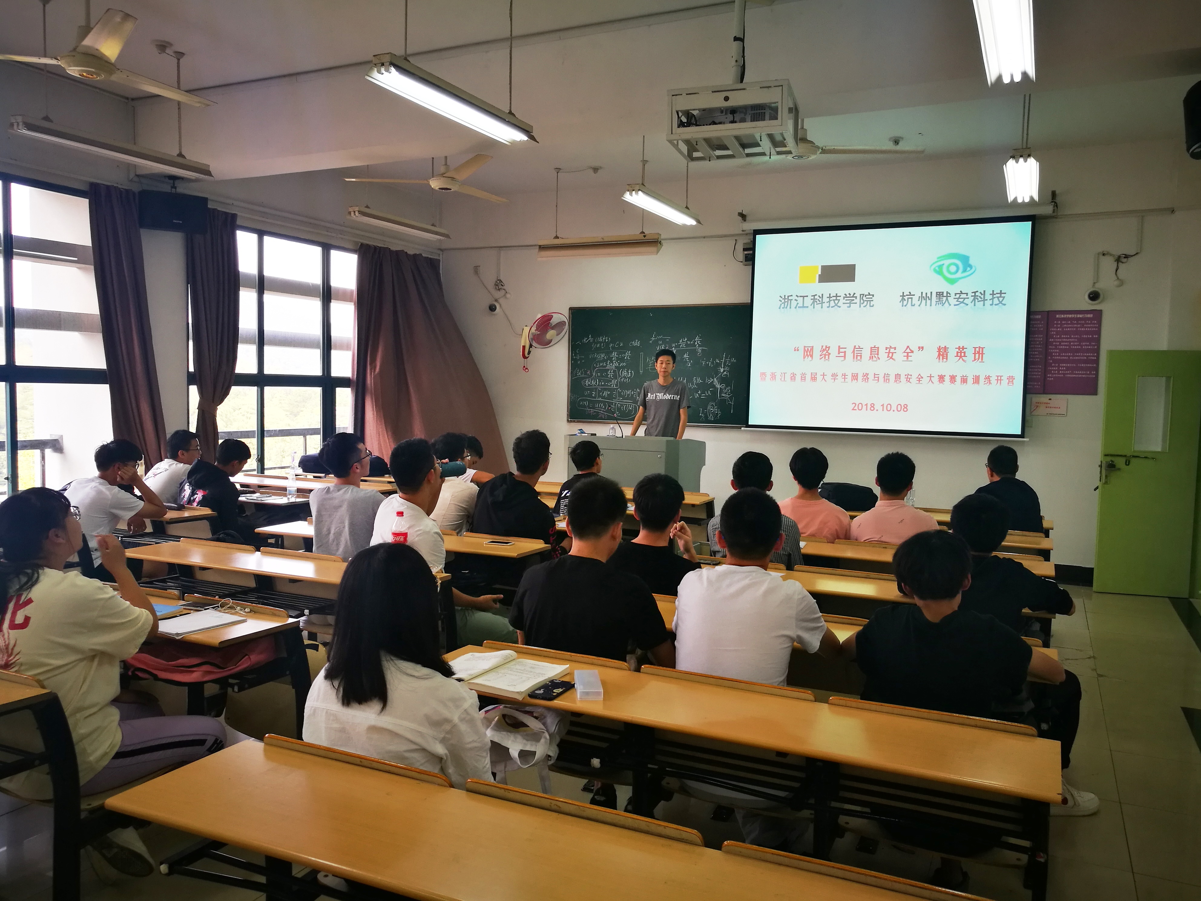 10月8日,由我校信息与电子工程学院与杭州默安科技联合举办的“网络与信息安全精英班”暨“网络安全竞赛训练营”开营,来自全校50多位同学参加开营课程。