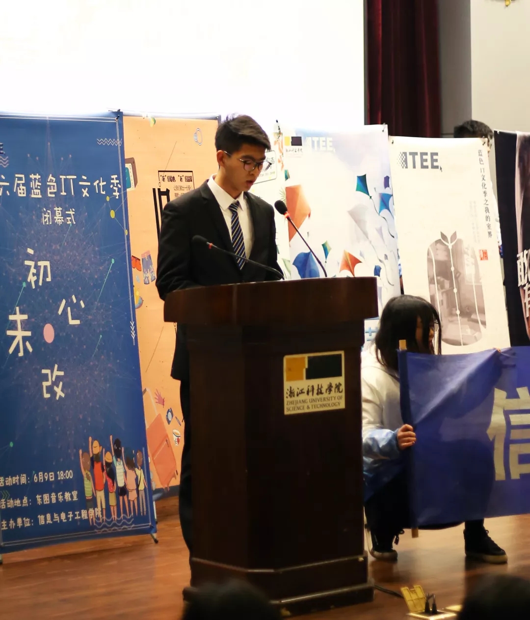 学生会成员在展示过程中的工作井然有序,本次汇报充分体现了信息学院特色。展示最后,信息学院向其他学院表达了我们的念想——信息学子共助科院大学梦!这一口号将在之后融入学院各项工作中,共助我们的大学梦。在之后的答辩环节中,我们抽取到的题目是:学院学生会在本学院的文化建设上有哪些可取之处?在这里,不得不讲到我们学院的“蓝色IT文化季”,我们通过创意蓝、公益蓝、环保蓝、科技蓝、活力蓝等一系列“蓝色文化”活动,形成了我们信息学院专属蓝色文化品牌。
