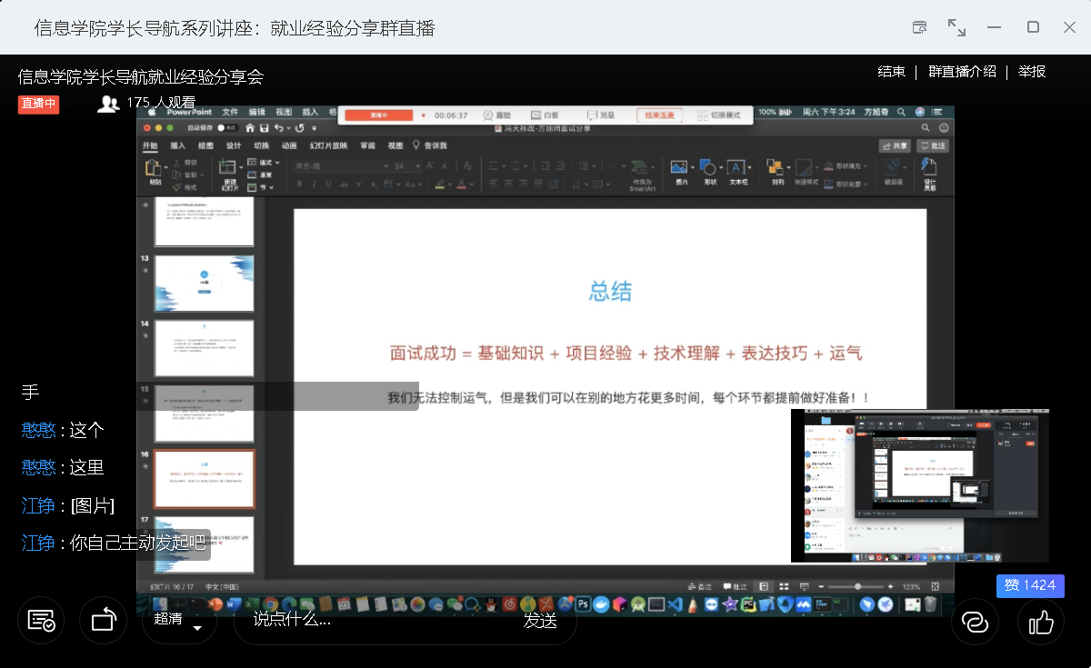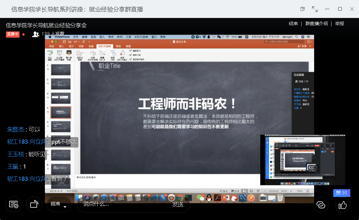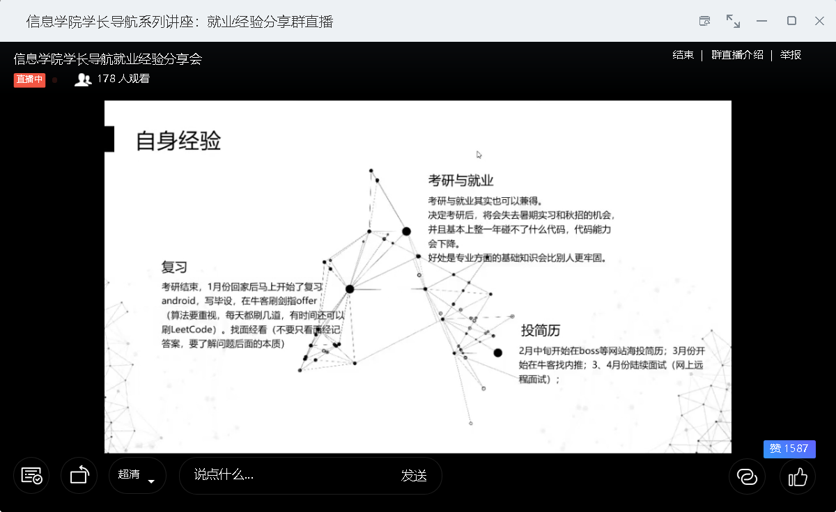 于5月23日下午14点30分举办了线上就业经验分享会。信息学院18级辅导员谢超凡老师,以及各年级同学180余人参加了本次讲座。