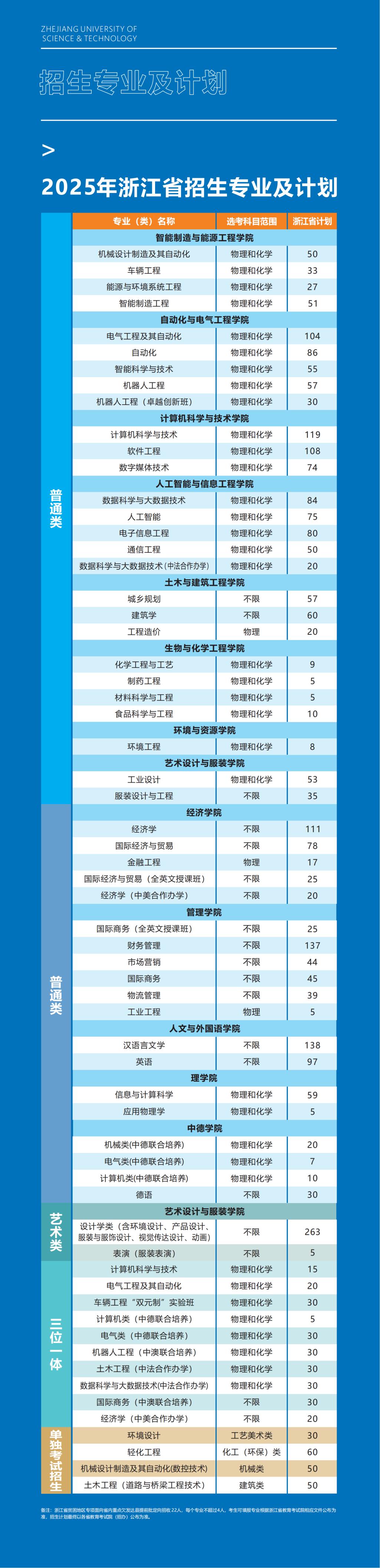2025年计划招生5970人,其中浙江省内4106人,包括“三位一体”综合评价招生240人、普通类专业2277人、艺考类统考批(设计学类、表演(服装表演))268人、地方专项计划22人、单考单招本科459人(含中本一体化转入)、二学位60人、专升本计划780人。面向浙江省以外的23个省(市、自治区)计划招生1854人。不分省招生计划10人(预科班转入)。另外学校联合招收华侨港澳台学生计划10人,台湾地区学测入学10人。招生计划较上一年度有大幅度增加,除联合培养外,在本校就读的学生招生计划增加1170人。